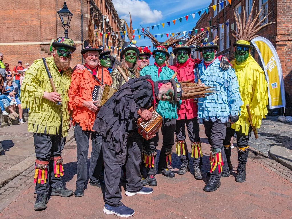 Morris dancing is at the heart of the festival. Teams from across Britain — often wearing brightly coloured sashes, ribbons, bells and flowers — will perform intricate dances in the streets. These lively and sometimes eccentric displays are rooted in old English rites linked to fertility, luck and the changing seasons.